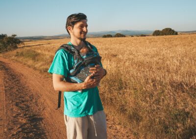 Más activo, aún requiere apoyo en sus momentos de descanso. El porteo facilita paseos, caminatas y rutinas diarias, reduciendo la carga física en brazos y espalda.